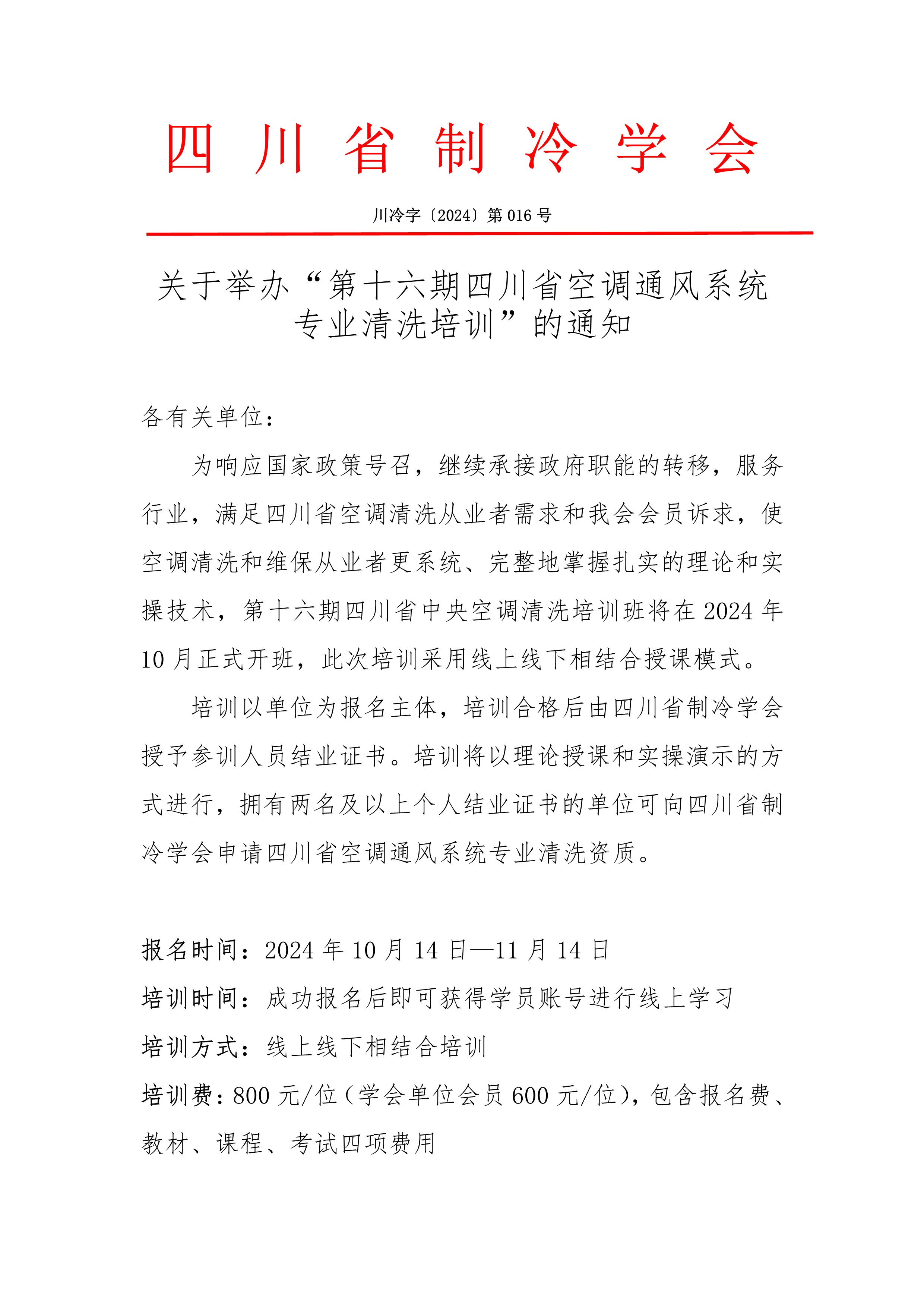 關于舉辦“第十六期四川省空調(diào)通風系統(tǒng)專業(yè)清洗培訓”的通知