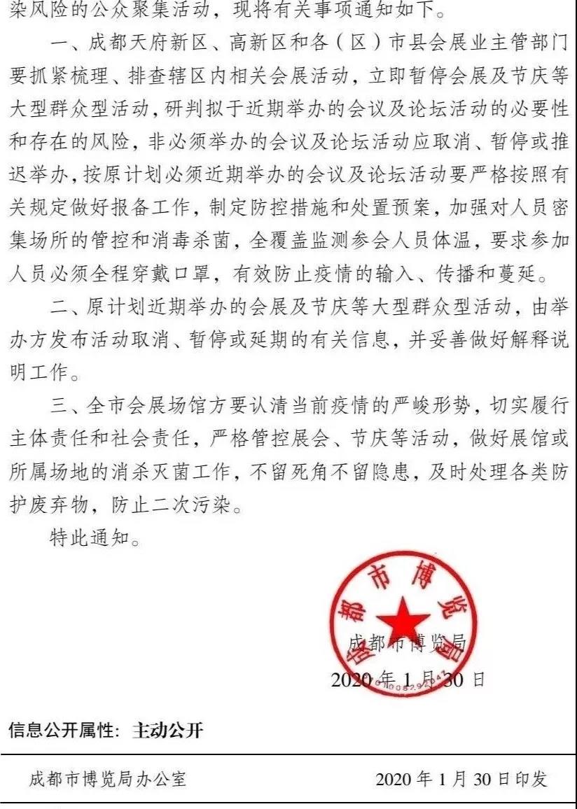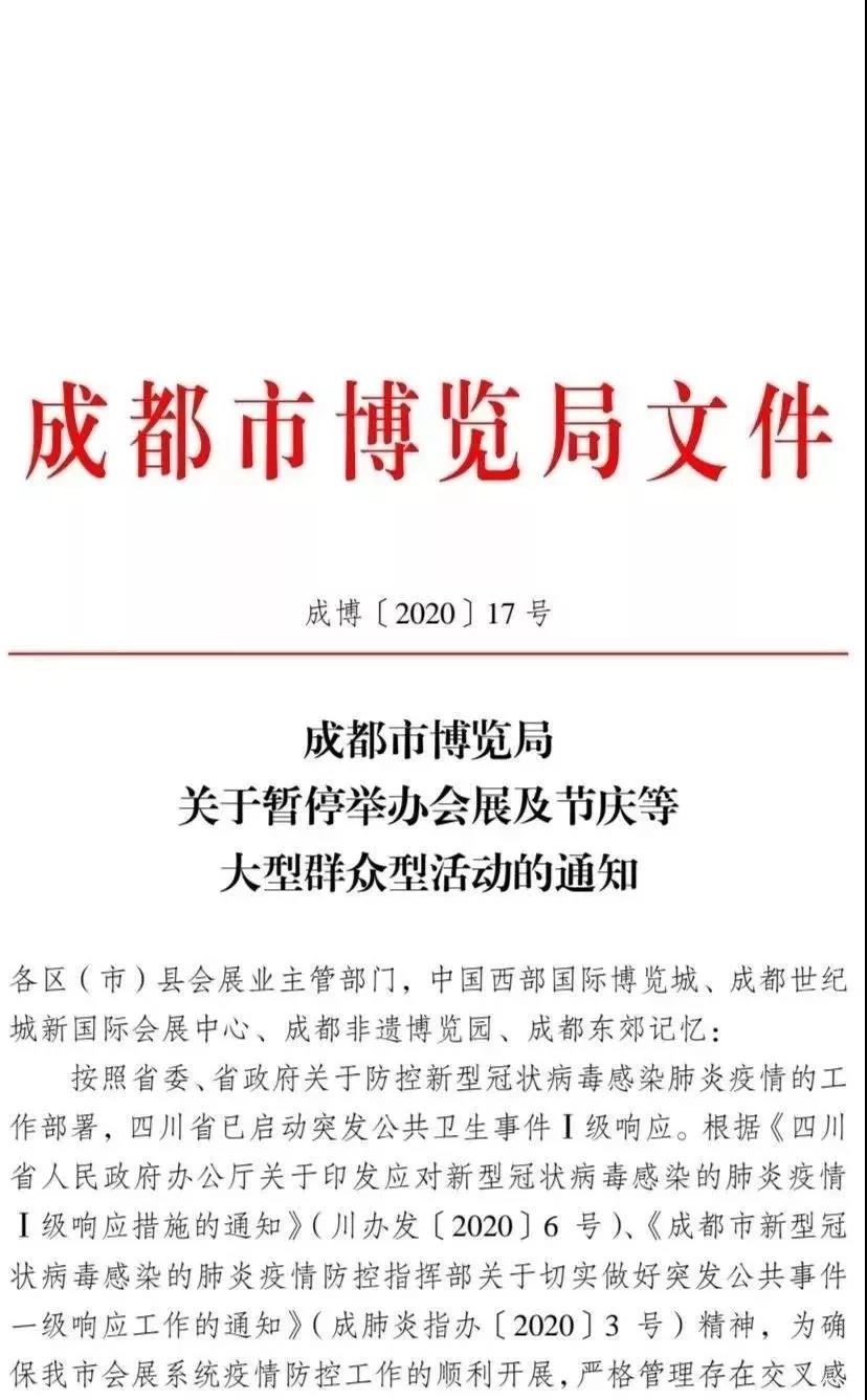 ? ? ? ? 鑒于目前全國人民抗擊新型冠狀病毒感染肺炎疫情的堅(jiān)戰(zhàn)已進(jìn)入關(guān)鍵時(shí)刻,四川省已啟動(dòng)突發(fā)公共衛(wèi)生事件一級響應(yīng),根據(jù)黨中央、國務(wù)院關(guān)于應(yīng)對新型冠狀病毒感染肺炎疫情防控工作部署以及《成都市博覽局文件》成博[2020]17號的要求(詳細(xì)請見下文),在疫情防控期間暫停一切會(huì)展及節(jié)慶等大型群眾聚集性活動(dòng)。